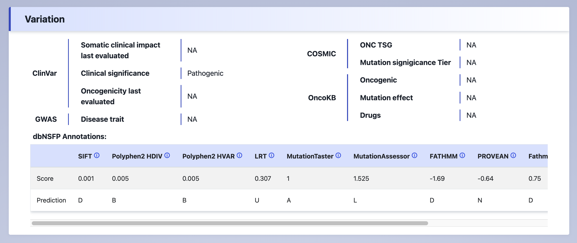 Somatic clinical impact last evaluated- The most recent date when the somatic clinical impact was evaluated.Clinical significance- The clinical significance of the mutation. Asssertion criteria includes: pathogenic, likely pathogenic, uncertain significance, benign, likely benign.Oncogenicity last evaluated- The most recent date of oncogenicity evaluation.ONC TSG- Classification of COSMIC as oncogene or tumor suppressor gene, depending on its somatic mutation profile and functional role in oncogenesis.Mutation signigicance Tier- The tier of mutation significance based on the COSMIC database.Oncogenic- Oncogenic activity classification.Mutation effect- Biological consequences of mutations annotated.Drugs- Targeted drugs/therapies curated by OncoKB.dbNSFP annotation- 11 tools for predicting the effect of mutations on function from dbNSFP database.