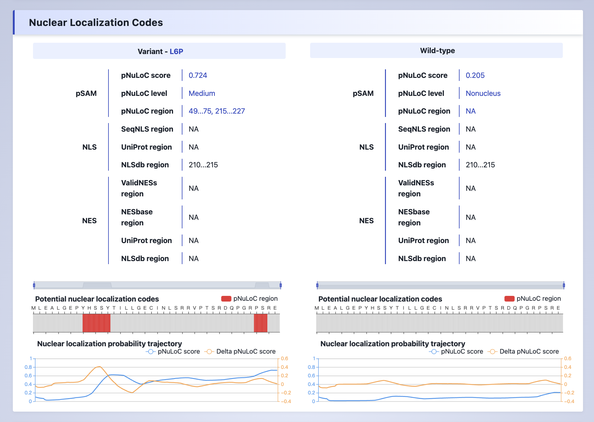 pNuLoC score- The nuclear localization probability predicted by pSAM.pNuLoC level- The nuclear localization level predicted by pSAM, categorized as High (≥0.737), Medium (0.476-0.736), Low (0.328-0.475), and NonNucleus (<0.328) based on nuclear localization probability thresholds.pNuLoC Region- The determinants for nuclear localization (DNL) predicted by pSAM.SeqNLS region- The experimental validataed NLS region collected from SeqNLS database.UniProt region- The experimental validataed NLS or NES region collected from UniProt database.NLSbase region- The predicted NLS or NES region collected from NLSbase database.ValidNESs region- The experimental validataed NES region collected from ValidNESs database.NESbase region- The experimental validataed NES region collected from NESbase database.Poteintial nuclear localization codes- The determiants for nuclear localization predicted by pSAM.Nuclear localization probability trajectory- The nuclear localization probability trajectory predicted by pSAM, see the paper for details.