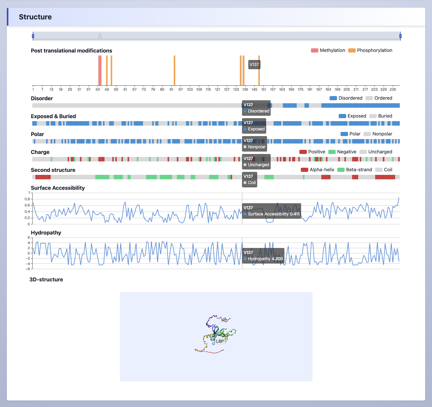 The PTM information, disorder values, surface accessibility, polar, charge and hydropathy information, secondary structure, and 3D-structure of the protein.