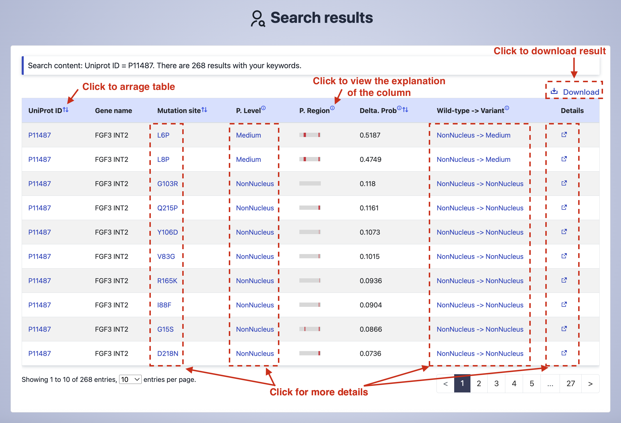 In the "Search results" page, you can click the "Download" button to get the data in txt formats. Explanation of the columns are shown by clicking the icon. The detailed information about a specific variant are displayed by clicking any "Mutation site", "P. Level", "Wild type -> Mutation" or the icon.