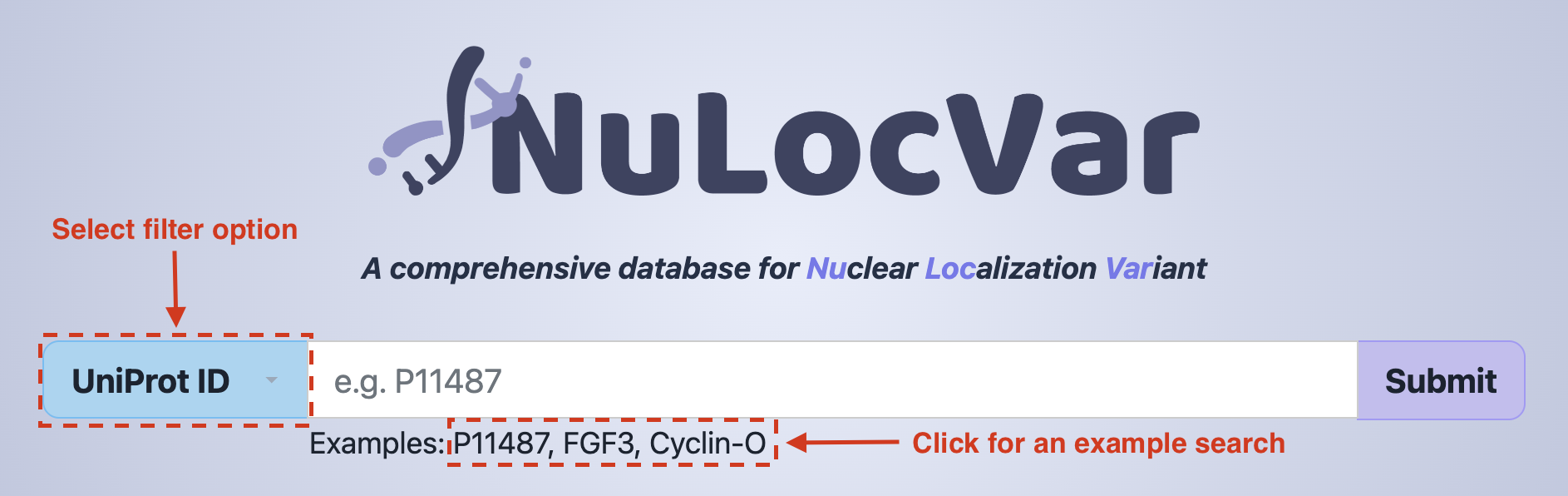 In the "Search"page, you can use the "Submit" button on the "Search" page to find specific variants by Uniprot ID, gene name or protein name. You can also click example links to perform an example search.